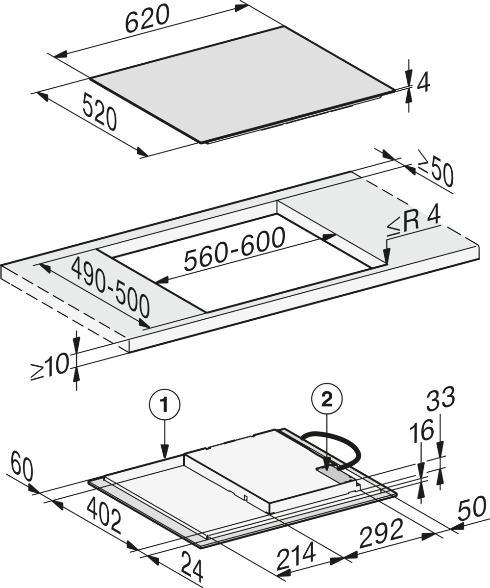Внутренние размеры выреза в мм (ширина) для встраивания заподлицо